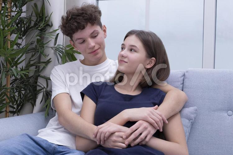 ソファーでくっついて座るティーンエイジャーのカップル - No: 4513237写真素材なら「写真AC」無料 フリー ダウンロードOK。
