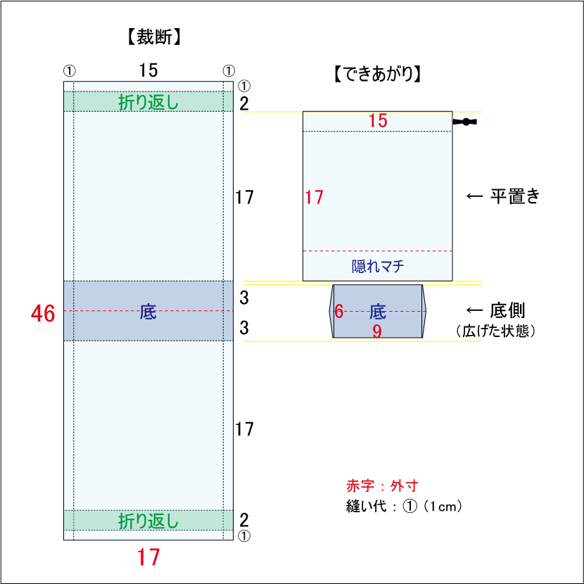 マチありタイプの巾着の布の計算方法 - ぎんがむちっく 手作り子ども服や可愛い小物たち。