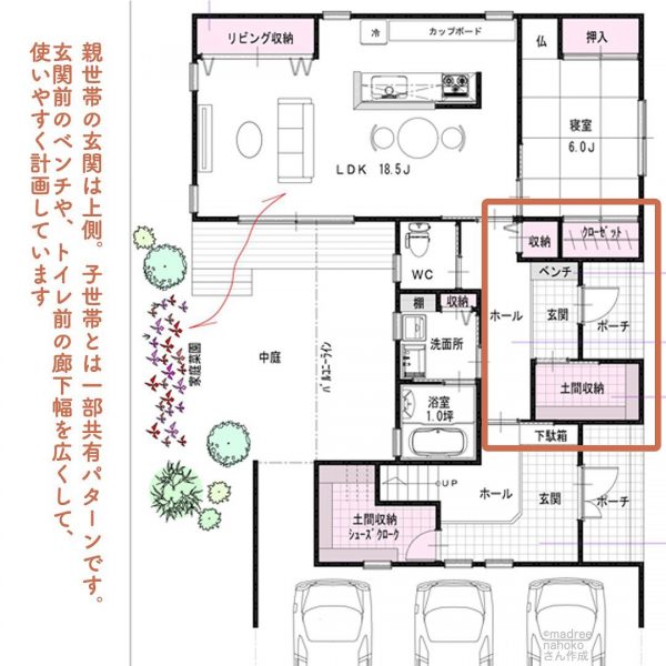 玄関で繋がるコの字型の二世帯住宅 ミヤワキホームの事例集。