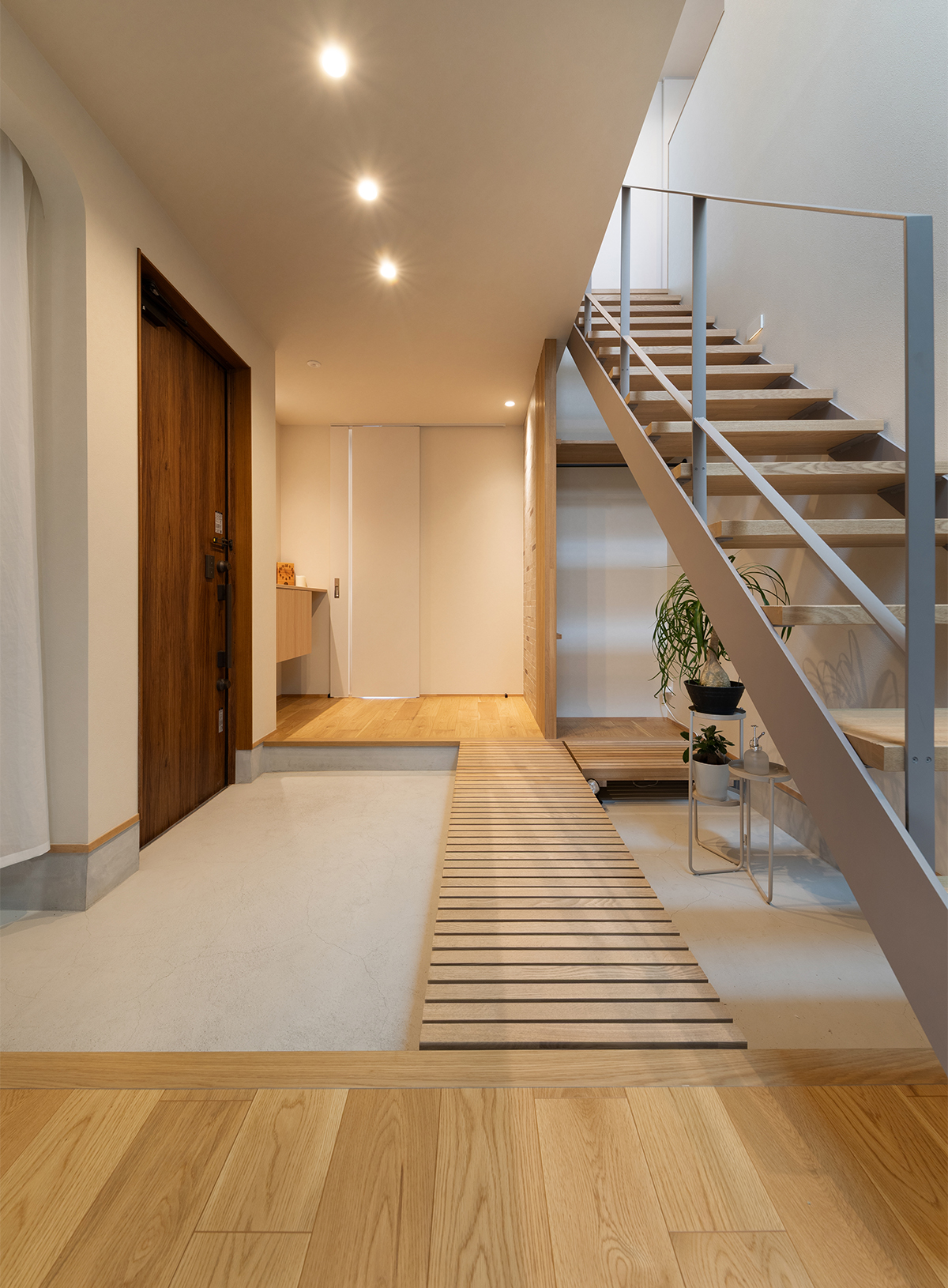 コの字型中庭がある二世帯住宅の設計事例。すのこ吹き抜けのある階段_千葉市房総イズムー千葉移住の注文住宅・セカンドハウス。