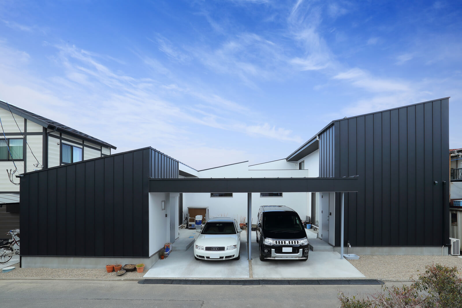 コの字の平屋の家2世帯をコの字に配置し、お互いをなんとなく感じられる距離感としています。親子のリビングは中庭のデッキでつなぎ、天気の良い日はデッキを通して行き来ができ、外からの視線を防ぎながら自然と親子の触れ合いができるプランです。外壁はブラックで。