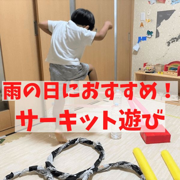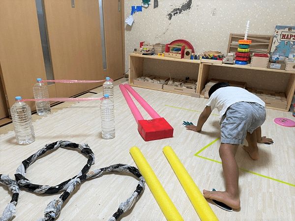 雨の日でもたっぷり体を動かせる サーキット遊び セリアのプールスティックと廃材で子どもの有り余る体力も消耗。