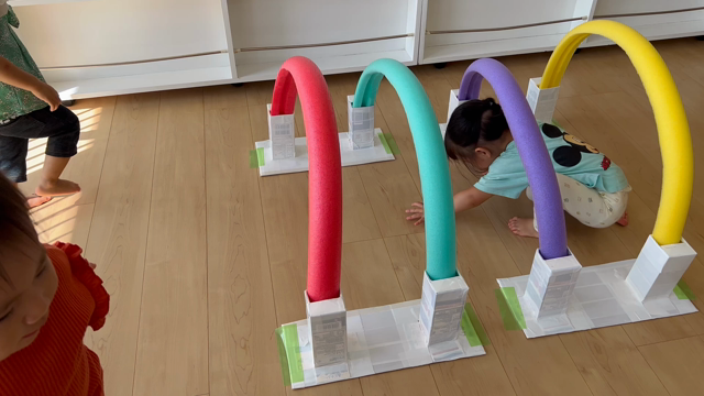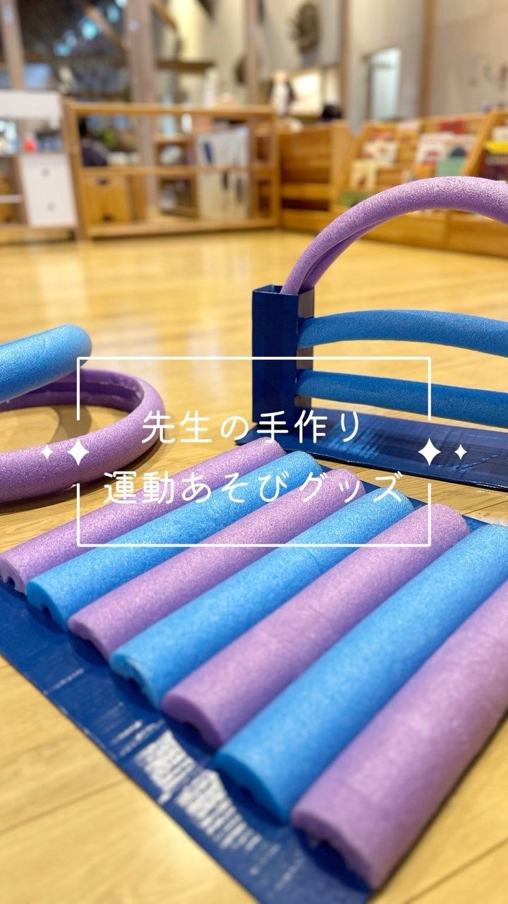 プールスティックde運動遊び」 皆さんが作られてるサーキットで、以前から作りたいなーと思っていましたが ようやくこの梅雨時期に完成です!※差し込み型にしてみました。 下は、養生テープで固定できるように、段ボールにガムテープを巻いています。 色んな色を使うと虹。