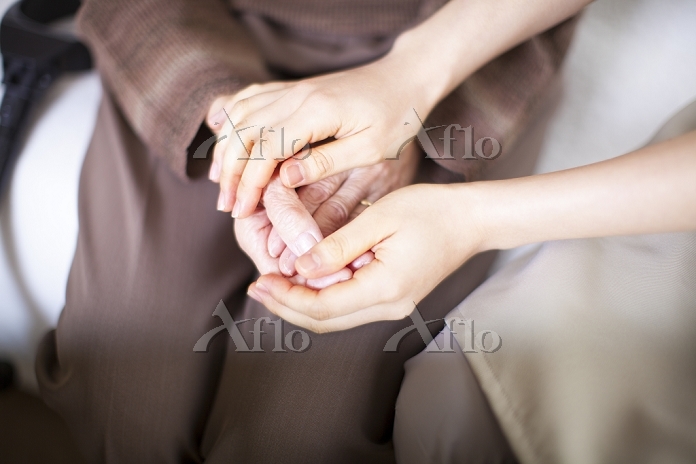 おばあちゃんと手を重ね合わせる介護士さん23194101 の写真素材 - アフロ。