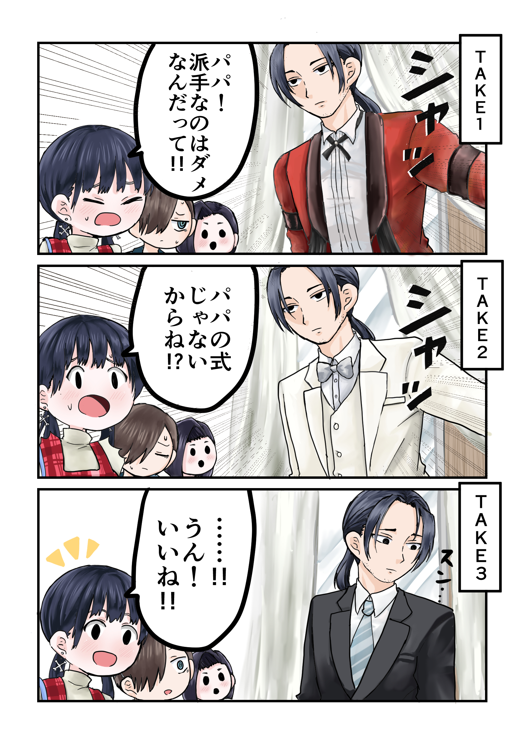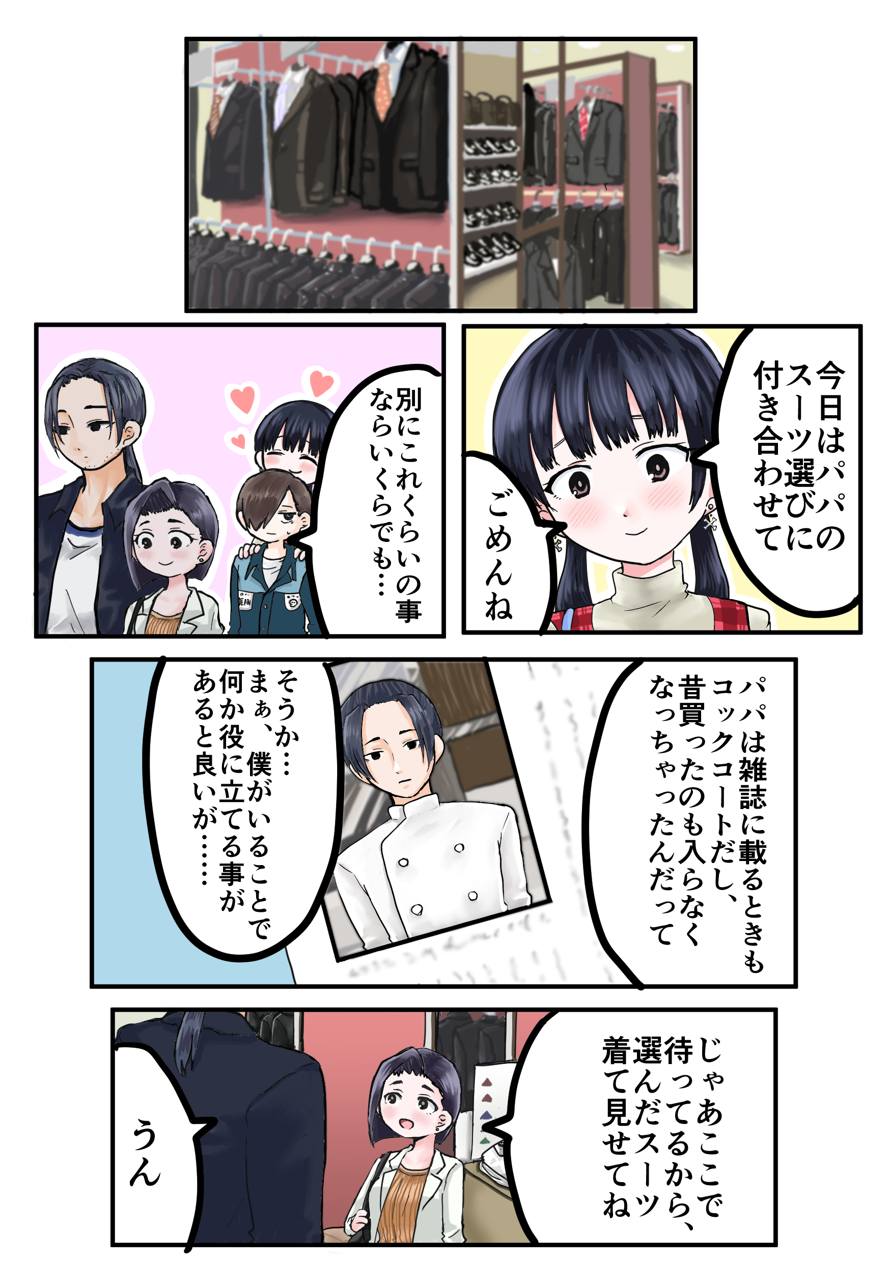 クリヤマツタケ on X: "6月12日の休のツイヤバが結婚直前とか結婚後に見えて妄想した、 市川と山田の結婚式用に山田パパのスーツ買いに行く話という捏造だらけな妄想漫画※細かいことは何も気にしてはいけないhttps:t.co wKiCxiwQ0b"X。