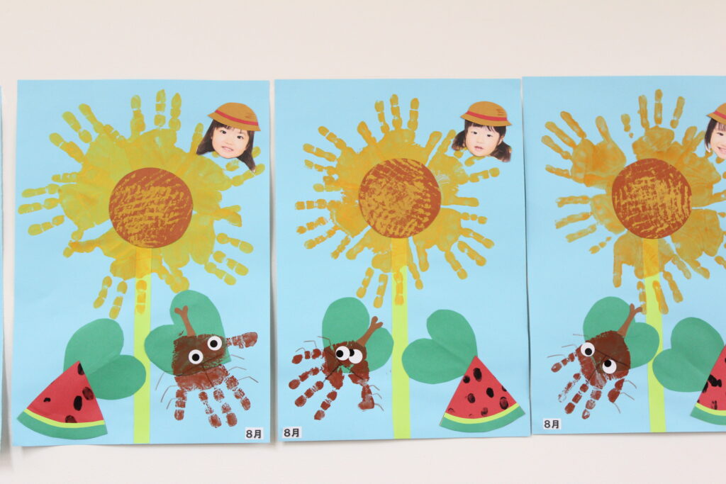 ひまわりにカブトムシ!手形アートで夏の壁面製作 - くじら保育園 都島東野田園。